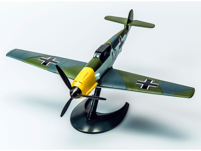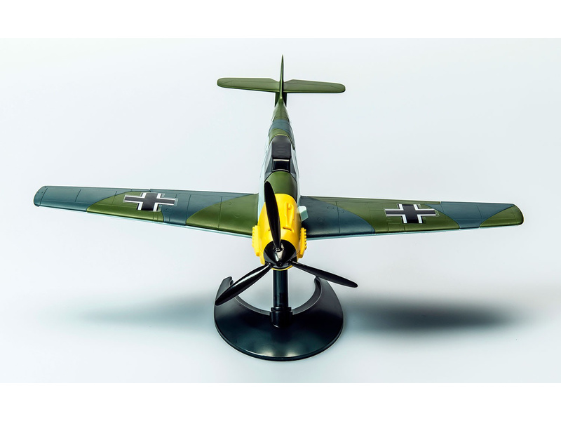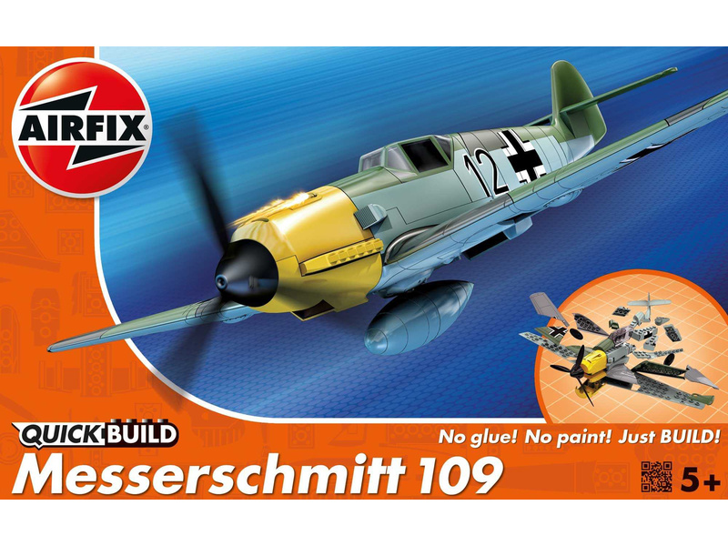 Plastikový model Airfix Quick Build J6001 – letadlo Messerschmitt 109. Stavebnice obsahuje 36 dílků, rozpětí křídel 252 mm, obtížnost 1.
