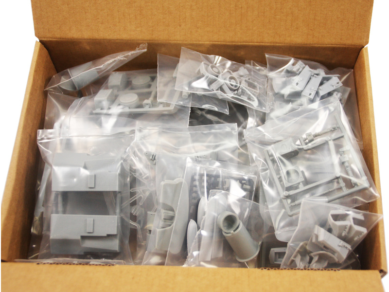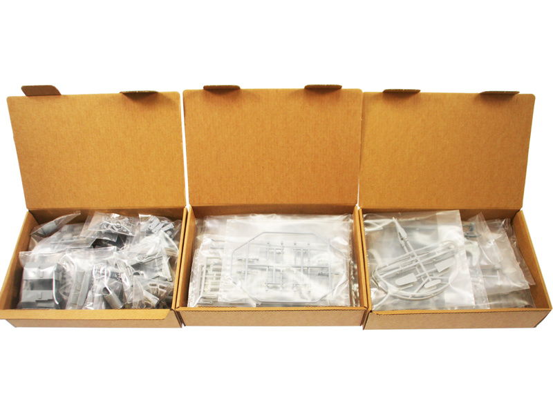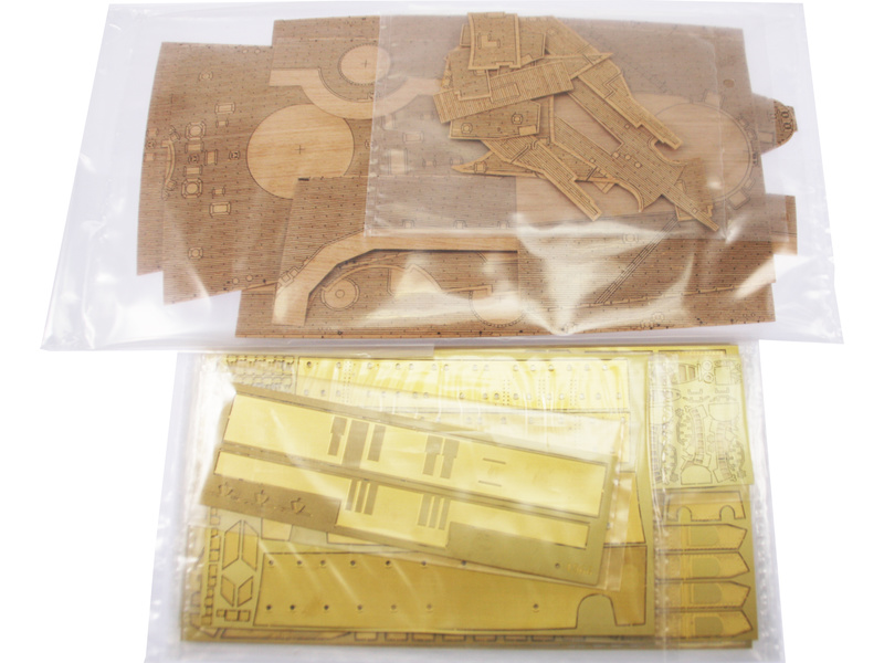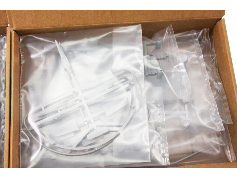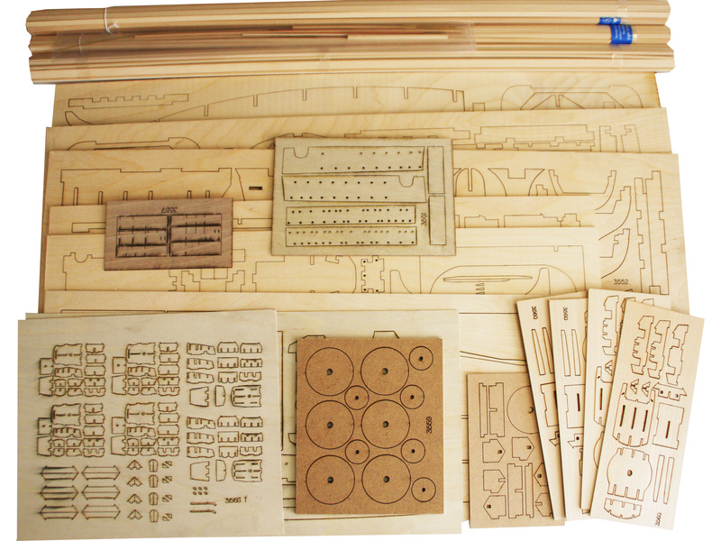 Balení obsahuje sadu překližkových dílů, sadu dřevěných lišt o různém průřezu, sáčky s drobnými díly, díly z mosazi, plastové výlisky, velkou sadu výkresů a vícejazyčný manuál.