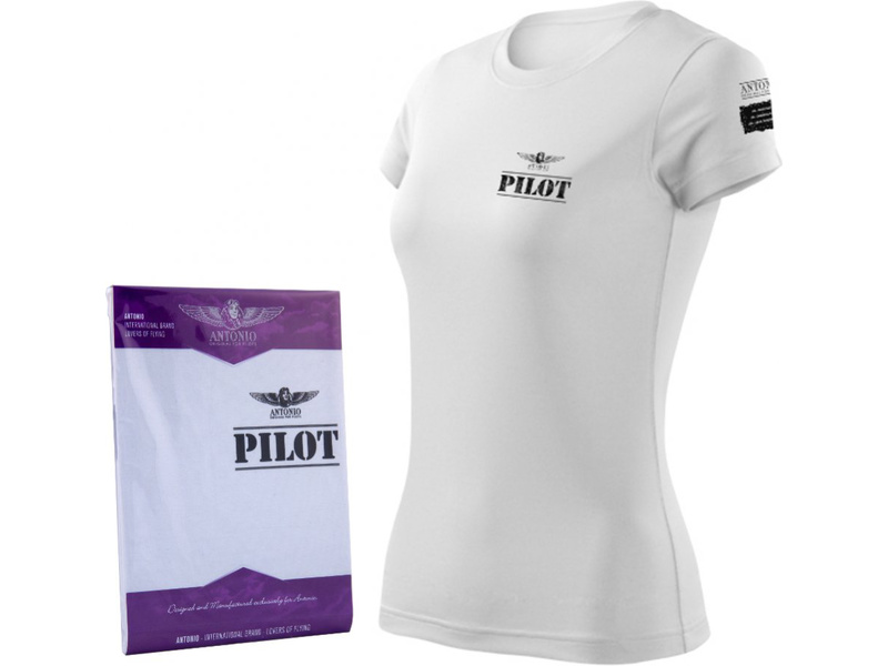 Dámské tričko Antonio Pilot s krátkým rukávem. 100% bavlna se silikonovou úpravou je zárukou příjemného pocitu při nošení. Látka 200 g/m², pleteno single jersey, bílá barva, luxusní dárkové balení.