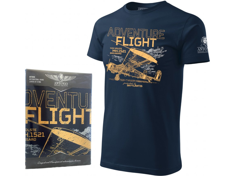 Pánské tričko s potiskem Antonio ADVENTURE FLIGHT. Grafika letadla Max Holste MH.1521 Broussard. Krátký rukáv, 100% bavlna se silikonovou úpravou je zárukou příjemného pocitu při nošení. Látka 200 g/m², pleteno single jersey, modrá barva, luxusní dárkové balení.