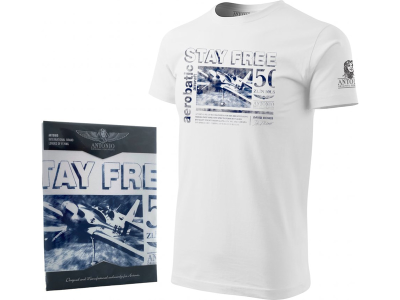 Pánské tričko Antonio Stay Free s krátkým rukávem. Motiv letounu Zlín Z-50. 100% bavlna se silikonovou úpravou je zárukou příjemného pocitu při nošení. Látka 200 g/m², pleteno single jersey, bílá barva, luxusní dárkové balení.