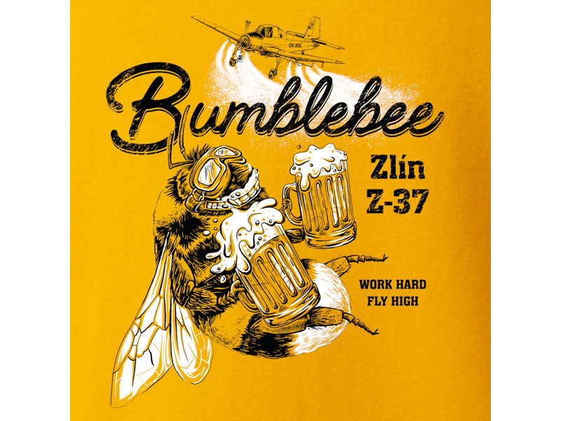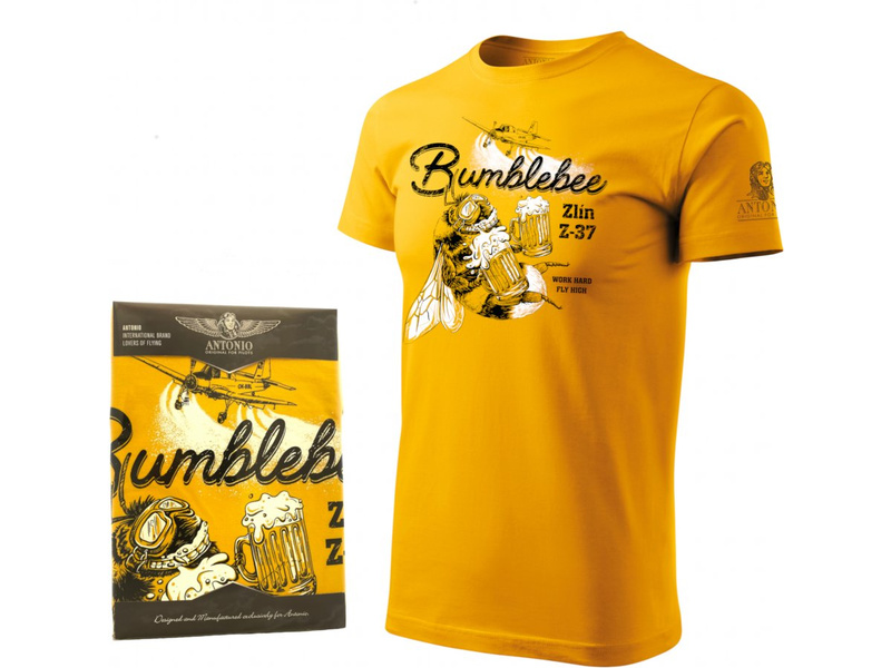 Pánské tričko s potiskem Antonio Zlín Z-37 BUMBLEBEE. Grafika čmeláka s práškovacím letadlem. Krátký rukáv, 100% bavlna se silikonovou úpravou je zárukou příjemného pocitu při nošení. Látka 200 g/m², pleteno single jersey, žlutá barva, luxusní dárkové balení.