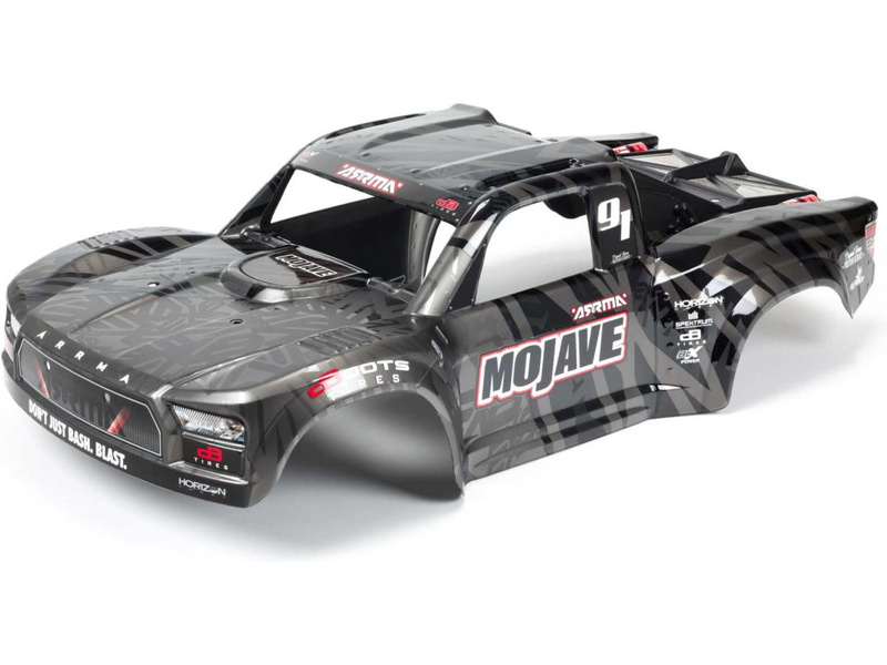 Arrma karosérie EXB černá: Mojave 1:7. Exkluzivní nabarvená karoserie s matnými a lesklými povrchy. Vyrobeno ze silného a odolného polykarbonátu. Vysoce kvalitní nálepky pro větší realističnost. Předvrtané otvory pro snadnou montáž.