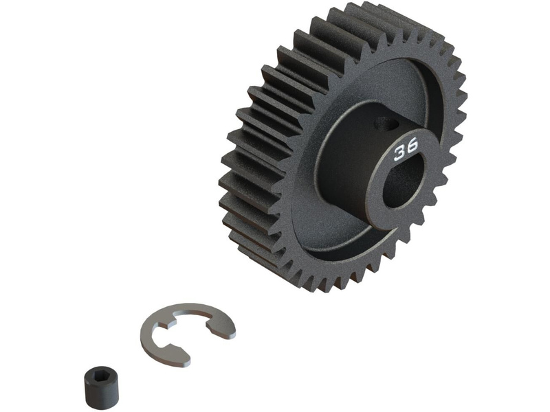 Arrma ocelový pastorek 36 zubů, modul M1, otvor Safe-D8. Otvor ve tvaru 'D' odpovídá profilu hřídele motoru s hřídelí 8mm a drážkou, proto se nemůže pastorek na hřídeli protočit. Stavěcí šroub - M4 x 4mm, segrovka 6mm. Precizně vyrobený široký profil zubu pro hladký chod.