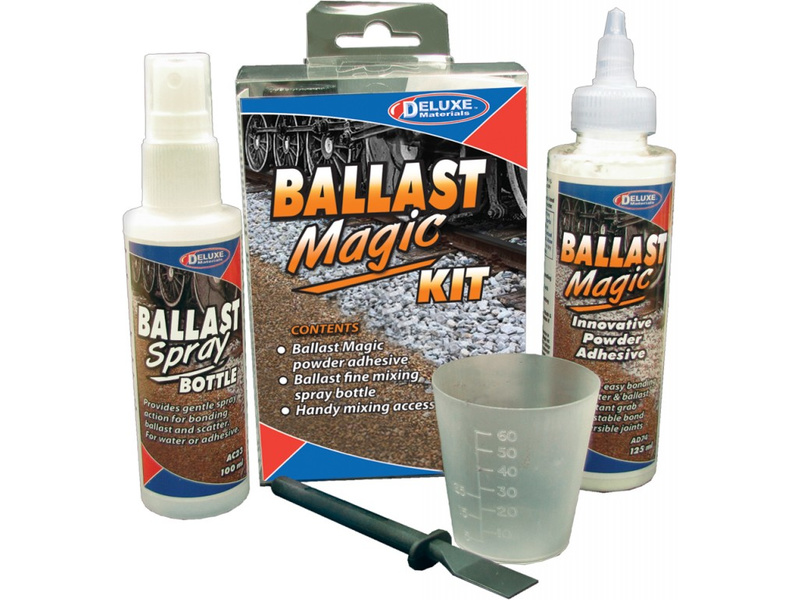Ballast Magic 125ml je speciální inovativní práškové lepidlo vhodné pro modelovou železnici a vytvoření např, šterkového kolejového náspu nebo nákladu šterku, uhlí, písku do vagonů. Sada obsahuje lepidlo Ballast Magic, míchací kelímek, špachtli, mechanický rozprašovač na vodu.