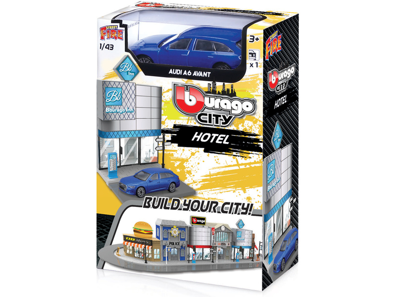 Herní set Bburago 18-31503 City - hotel s autíčkem Audi A6 Avant v měřítku 1:43 ( přibližně 10 cm velké ) pro malé milovníky aut. Set umožní malým řidičům si hrát, že jsou na dovolené. Balení obsahuje plastovou maketu hotelu, autíčko.