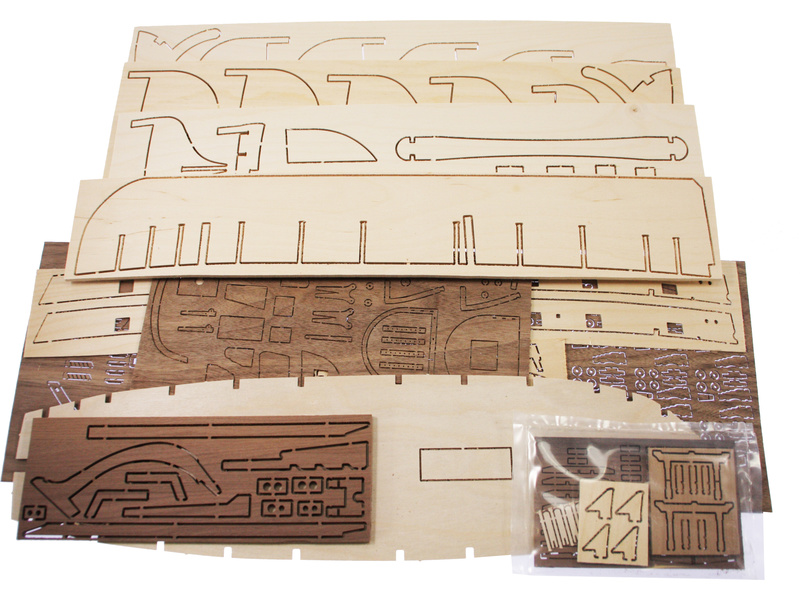 Po otevření víka krabice naleznete dřevěné díly modelu z překližky, sadu lišt, drobné součásti v sáčcích, sadu výkresů a manuál.