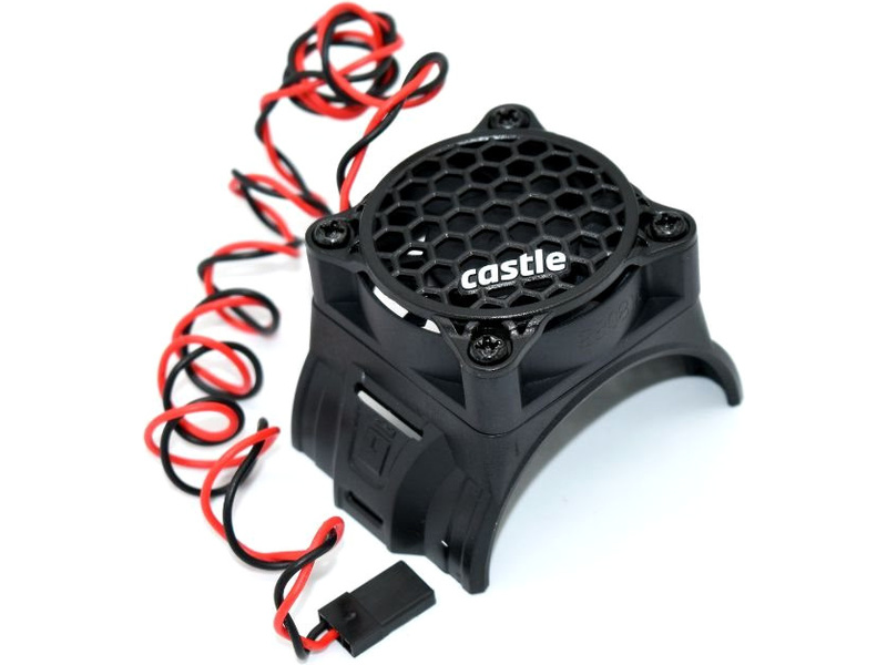 Castle aktivní chladič s ventilátorem o rozměrech - 40 x 40 x 7 mm. Pro motory o vnějším průměru 46 mm, jako například řada Castle 17xx. Snadná instalace pomocí stahovacích pásků. Napájení z přijímače (max.8.4 V). Maximální otáčky 10 000 ot/min.