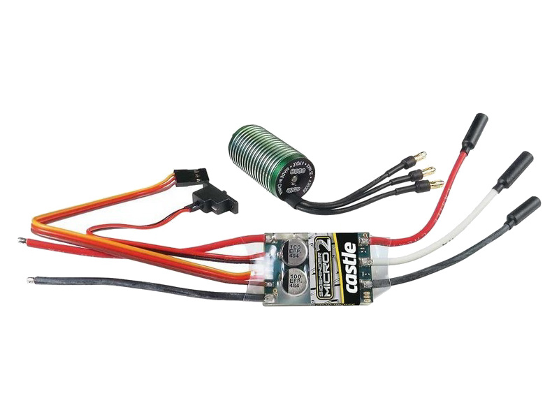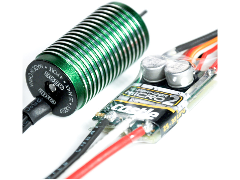 Střídavý 4-pólový motor Castle 0808 s 8300 ot/min/V s novým špičkovým regulátorem Castle Sidewinder Micro 2 je určený pro RC modely aut 1:18. Nastavitelná napětí BEC, protokol Castle Telemetry Link s telemetrickými daty, napájení 2 čl. LiPo.