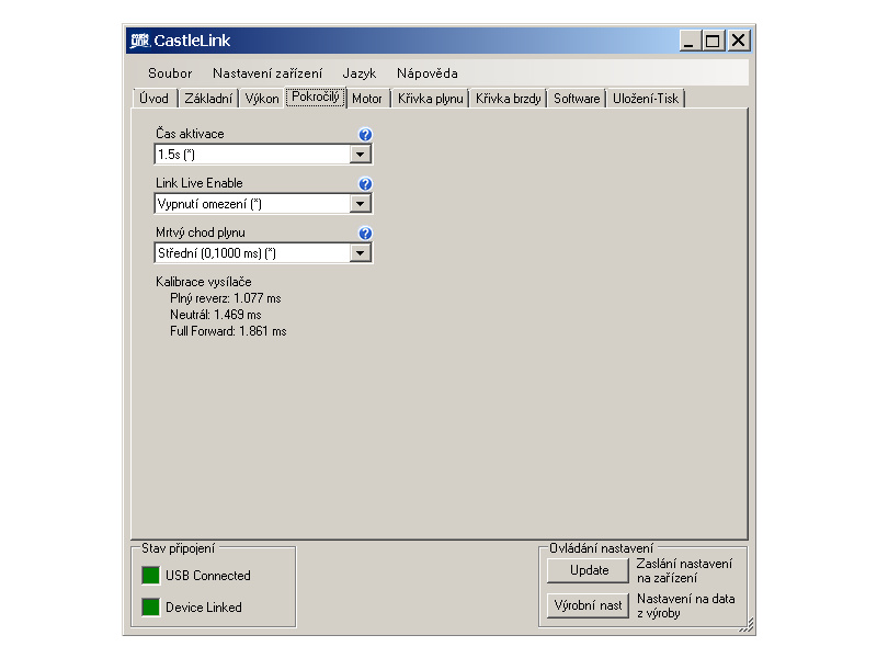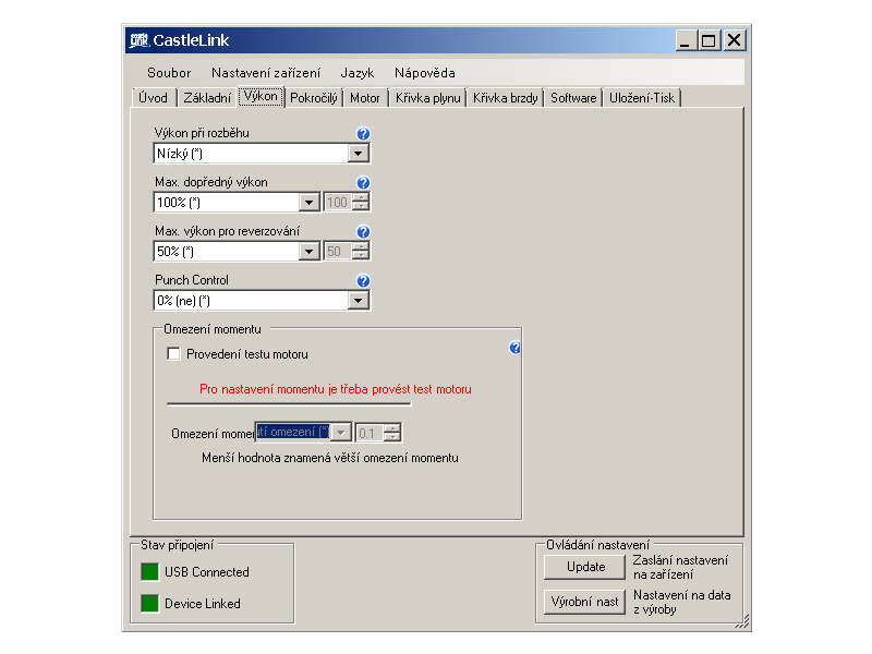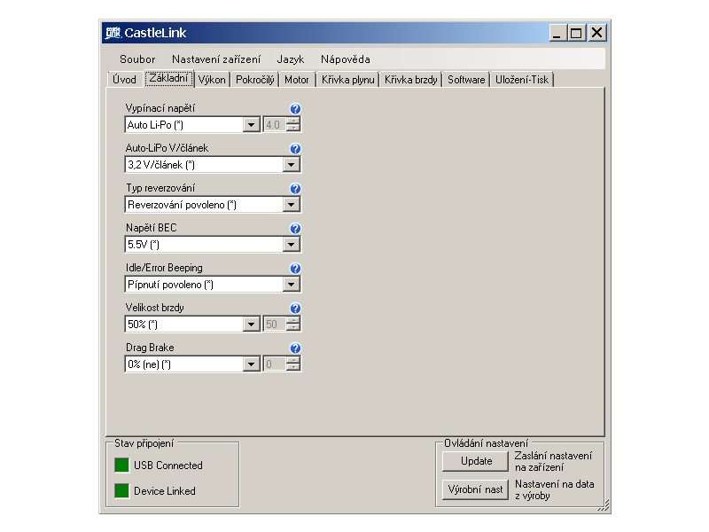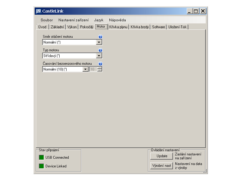 Základní parametry lze nastavit pomocí vysílače. Pro pokročilé programování doporučujeme zakoupit programovací kartu Castle Quick Field Car.