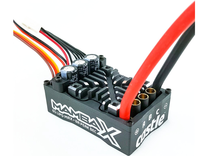 Regulátor Castle Mamba X obsahuje integrovaný zdroj BEC schopný dodat proud 8 A, napětí může být nastavitené v rozsahu 5,25 až 8,0 V.