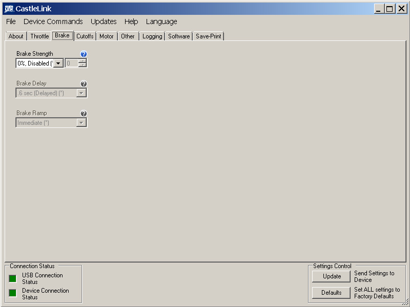 Základní parametry regulátoru lze naprogramovat pomocí plynové páky vysílače nebo programovací kartou. Veškeré parametry regulátoru se pak programují volně dostupnou aplikací Castle Link určené na počítače s operačním systémem Windows. Regulátor se připojuje k počítači přes speciální převodník do USB portu. Pro snazší připojení USB převodníku doporučujeme zakoupit programovací propojku Quick Connect.