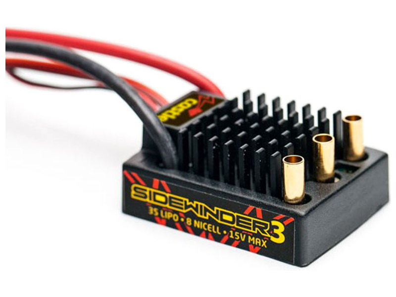 Regulátor Castle Sidewinder V3 má voděodolné provedení a je určen pro lehké až středně těžké RC modely aut v měřítku 1:10. Napájecí napětí regulátoru je 2 až 3 čl. LiPo nebo 6 až 8 čl. NiMH. Sidewinder 3 nabízí špičkové softwarové funkce a USB programování pomocí Castle USB adaptéru nebo programovací karty (prodávají se samostatně).
