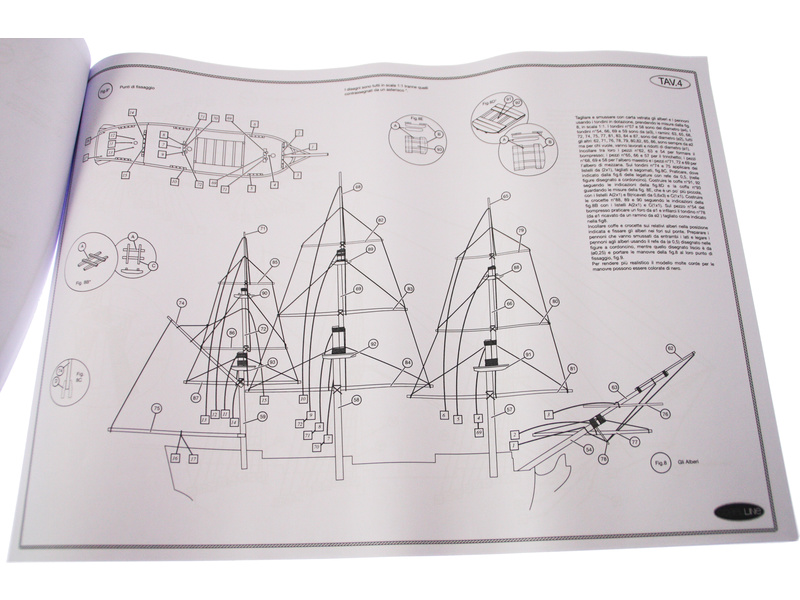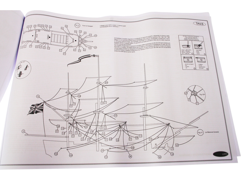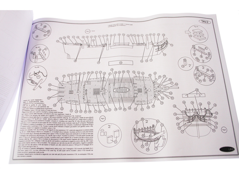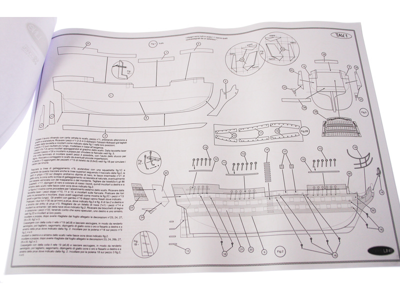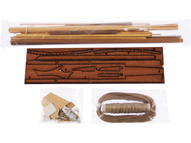 Balení obsahuje sadu překližkových dílů, sadu dřevěných lišt o různém průřezu, blistr s drobnými díly, sadu výkresů a manuál anglický, německý, francouzský a italský.