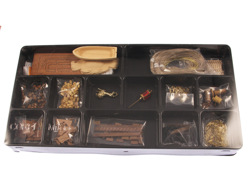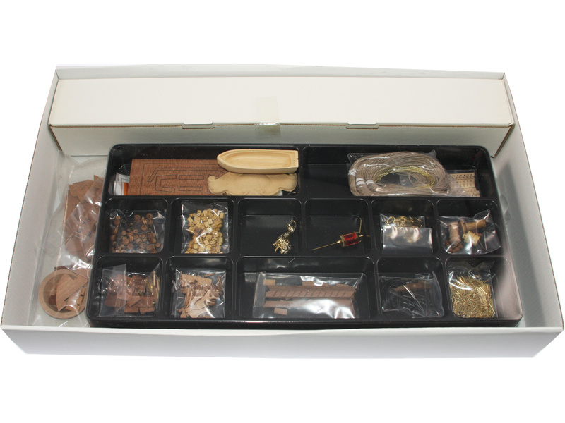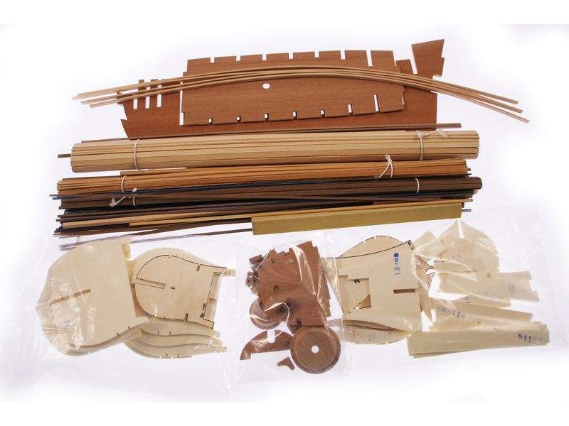 Balení obsahuje sadu překližkových dílů, sadu dřevěných lišt o různém průřezu, blistr s drobnými díly, sadu výkresů a anglický manuál.