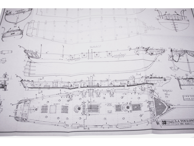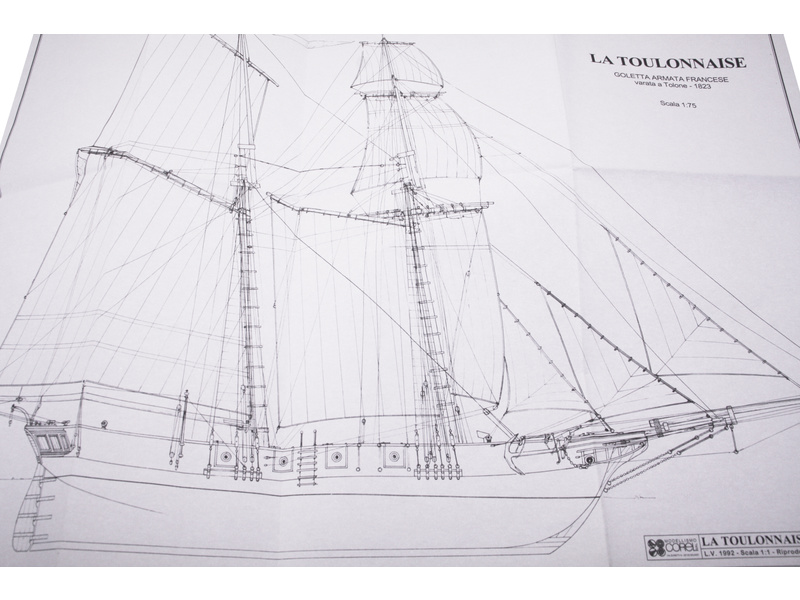 Stavebnice neplovoucího modelu COREL La Toulonnaise v měřítku 1:75 z roku 1823. Francouzský škuner z roku 1823, který se zúčastnil války proti Španělsku. V balení jsou dřevěné díly, lišty a množství kování, lanoví, plátno na plachty, plány atd.
