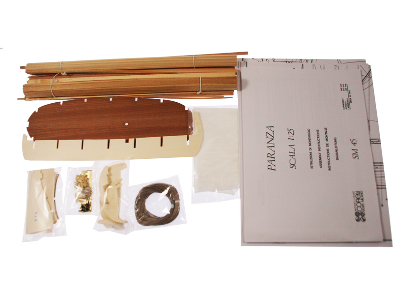 Balení obsahuje sadu překližkových dílů, sadu dřevěných lišt o různém průřezu, sáčky s drobnými díly, díly z mosazi, materiál na plachtu, sadu výkresů a vícejazyčný manuál.