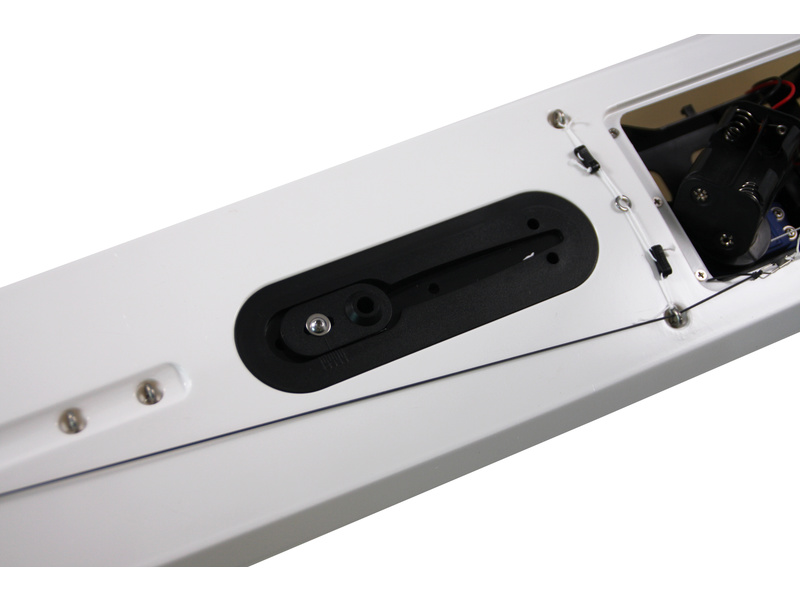 Servo řízení s kovovými převody je umístěno v trupu, táhlo je vedeno přes gumovou průchodku ke konektoru na páce řízení.