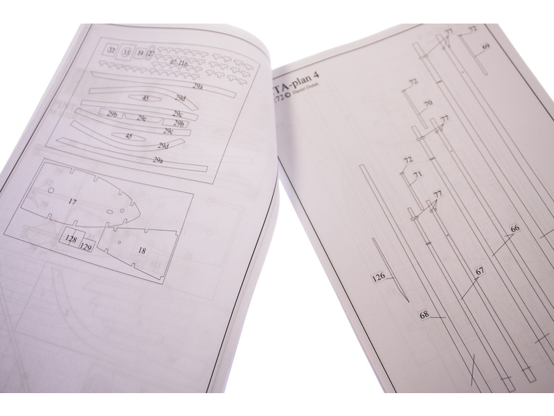 Po otevření víka krabice naleznete dřevěné díly modelu z překližky, sadu lišt, drobné součásti uzavřené v plastovém průhledném blistru, sadu výkresů a manuál.