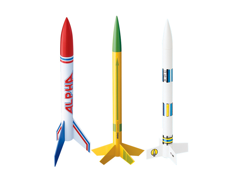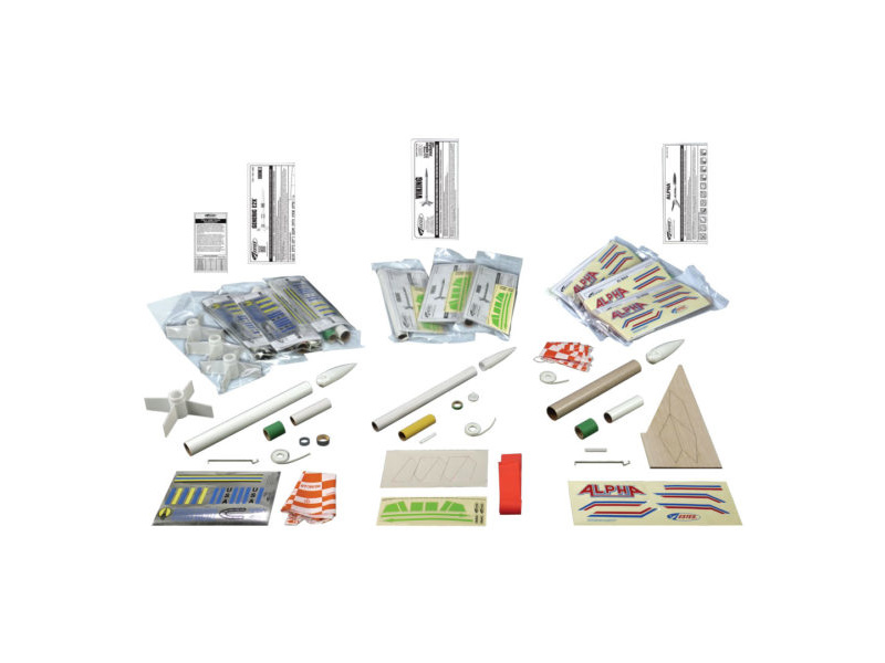Modely raket Estes Alpha, Viking, Generic jsou na raketové motory řady A - C. Hromadné balení tří našich populárních raket ve větším balení, které je určeno pro modelářské kroužky či školy. Obsahuje po 4 kusech rakety Alpha, Viking a Generic. Se 48 kombinacemi stabilizátorů pro ty, kdo chtějí experimentovat.