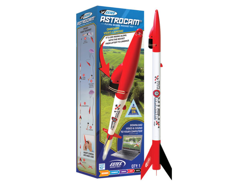 Model rakety Estes AstroCam Kit na raketový motor řady A - C, vyletí do výšky až 274 metrů. Součástí balení je mini USB kamera, kterou instalujete na model a můžete si následně prohlédnou záběry letu přímo z rakety. Kamera s 16 Gb SD kartou nahrává ve Full HD (1920x1080, 30 fps). Na zem se raketa bezpečně snese na padáku.