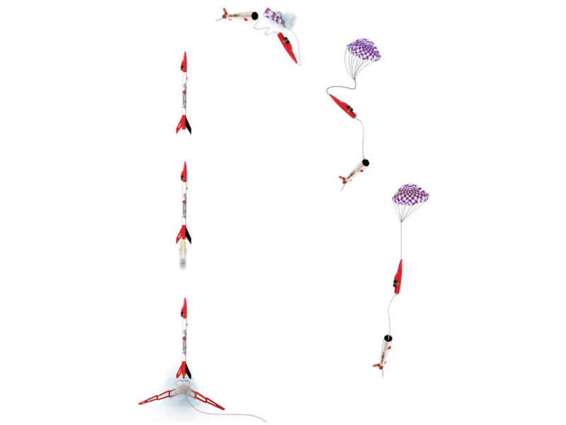 - Vrchol letu a výmet - po dohoření zpožďovací směsi dochází k zapálení výmetové směsi, která aktivuje návratový systém rakety.