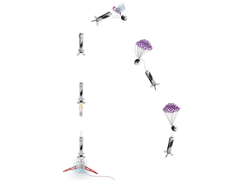 - Vrchol letu a výmet - po dohoření zpožďovací směsi dochází k zapálení výmetové směsi, která aktivuje návratový systém rakety.