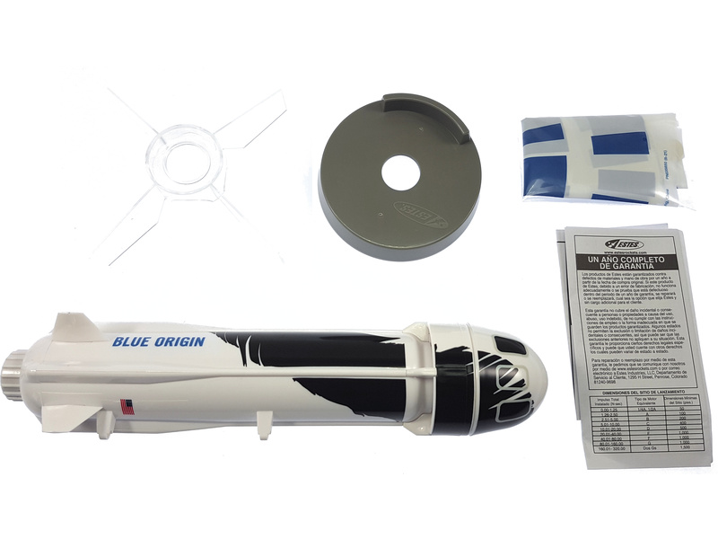Model rakety Estes Blue Origin New Shepard RTF je na raketové motory řady C. New Shepard je hotový model rakety připravený ke start. Dosahuje výšky až 122 m! Obsahuje kapsli pro užiteční zatížení. Po dosažení maximální výšky se snese na barevném padáku.