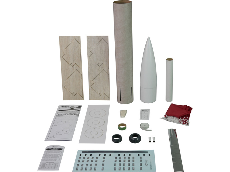 Balení obsahuje: tubus, špici, padák, držák motoru, stabilizátory, samolepky, návod CZ, manuál EN.