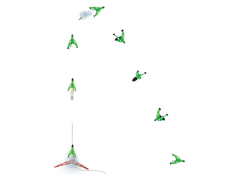 - Vrchol letu a výmet - po dohoření zpožďovací směsi dochází k zapálení výmetové směsi, která aktivuje návratový systém rakety.