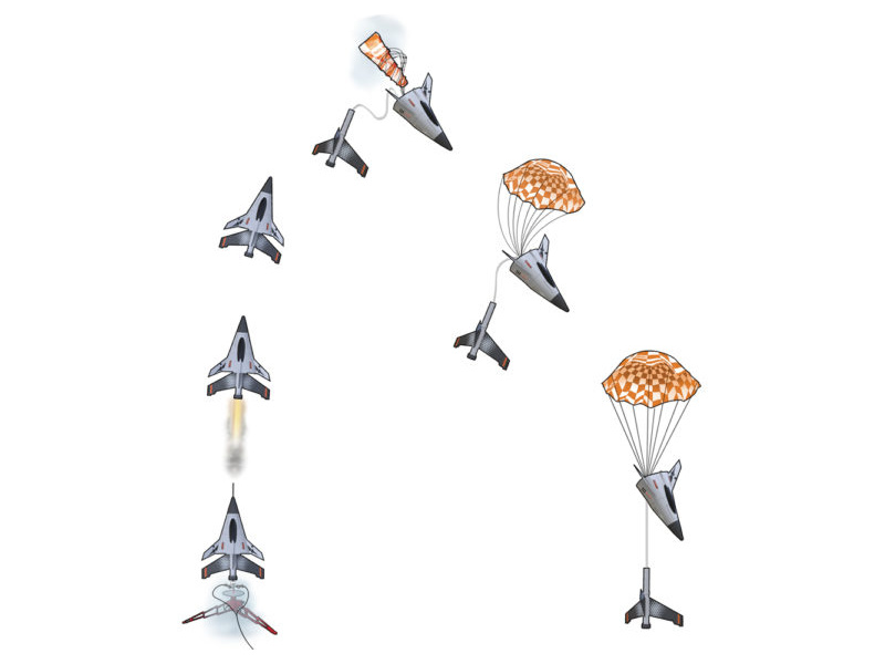 - Vrchol letu a výmet - po dohoření zpožďovací směsi dochází k zapálení výmetové směsi, která aktivuje návratový systém rakety.