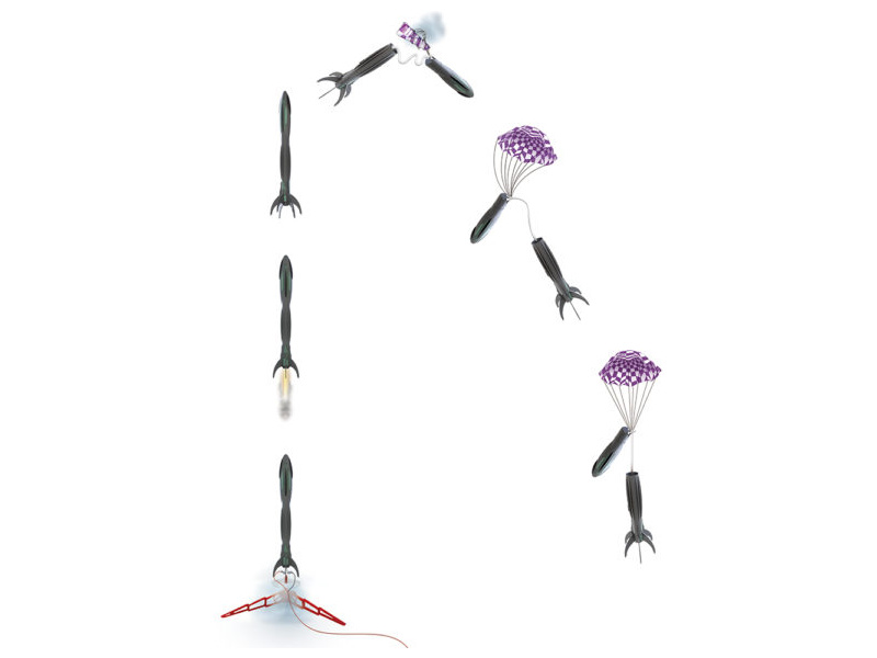 - Vrchol letu a výmet - po dohoření zpožďovací směsi dochází k zapálení výmetové směsi, která aktivuje návratový systém rakety.