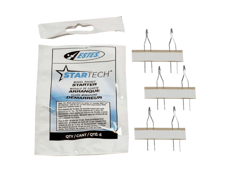 Elektrický startér Estes Startech je určený pro startování raketových motorů přes elektrický odpalovač. V balení je 6 ks. Startér je opatřen novou zápalnou směsí pro spolehlivé zažehnutí raketového motoru.