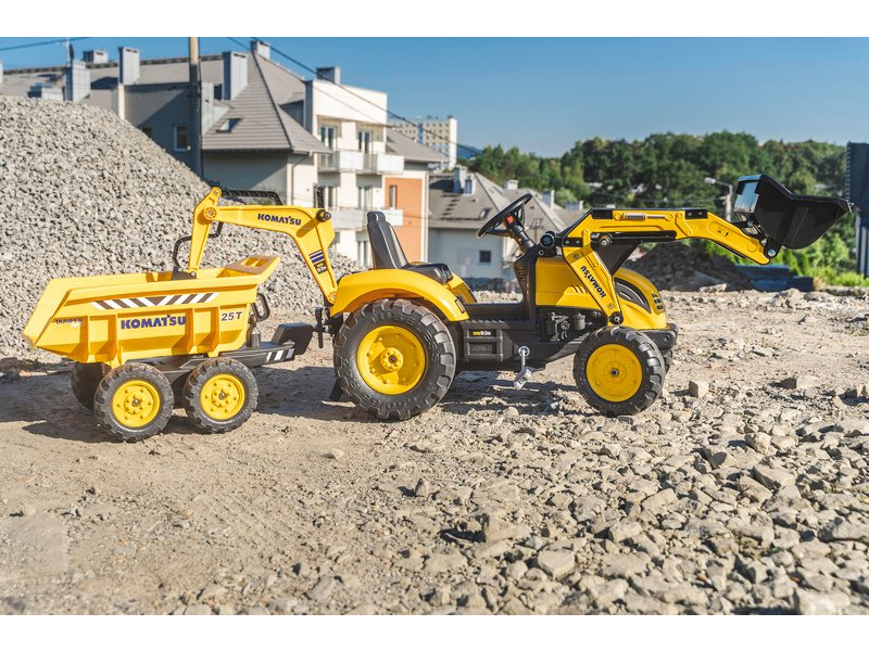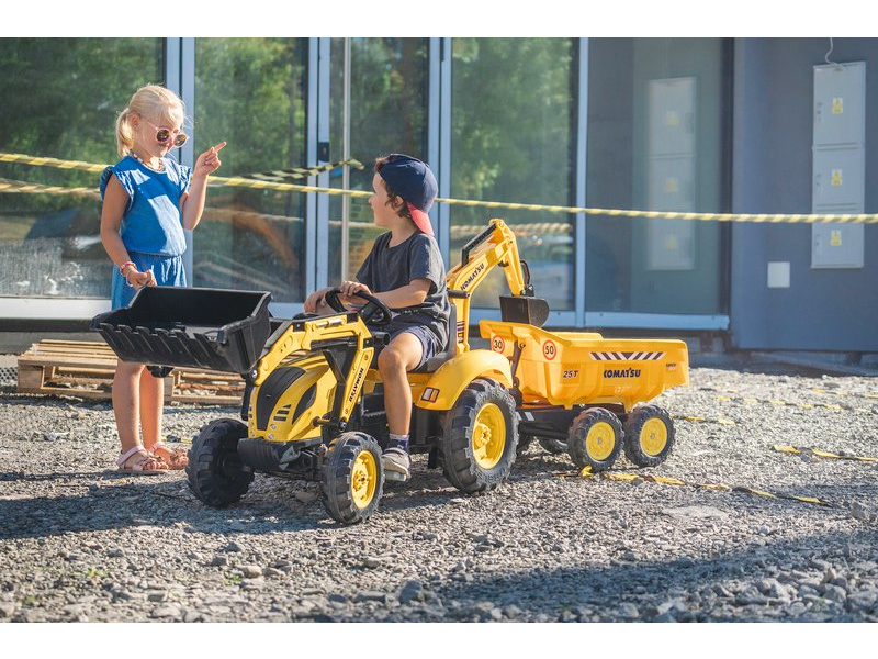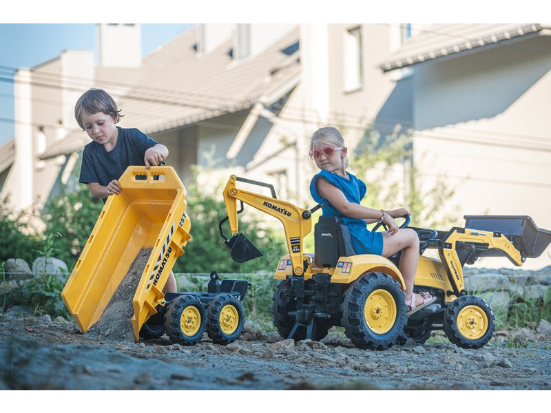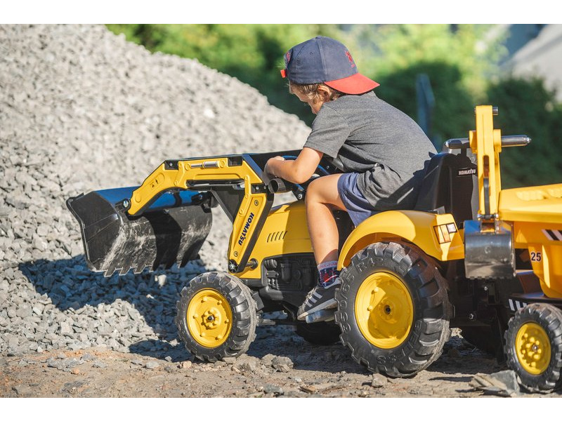 FALK - Šlapací traktor Komatsu s nakladačem, rypadlem a výklopnou vlečkou, je replikou skutečného traktoru.