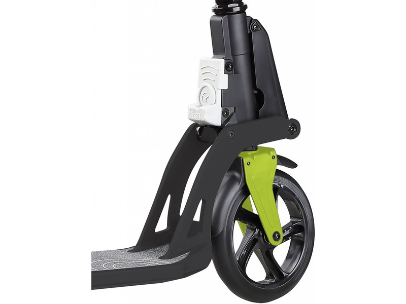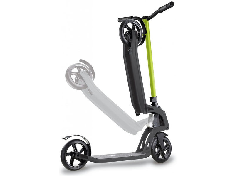 Koloběžka je vybavena unikátním skládacím systémem. Patentovaný píst usnadní a urychlí skládání. Stačí jen "kopnout" do tlačítka a koloběžka je během jedné sekundy složena. Koloběžka se tak dostane do velmi kompaktního tvaru, složenou ji můžete snadno převážet, uskladnit nebo vést za sebou.
