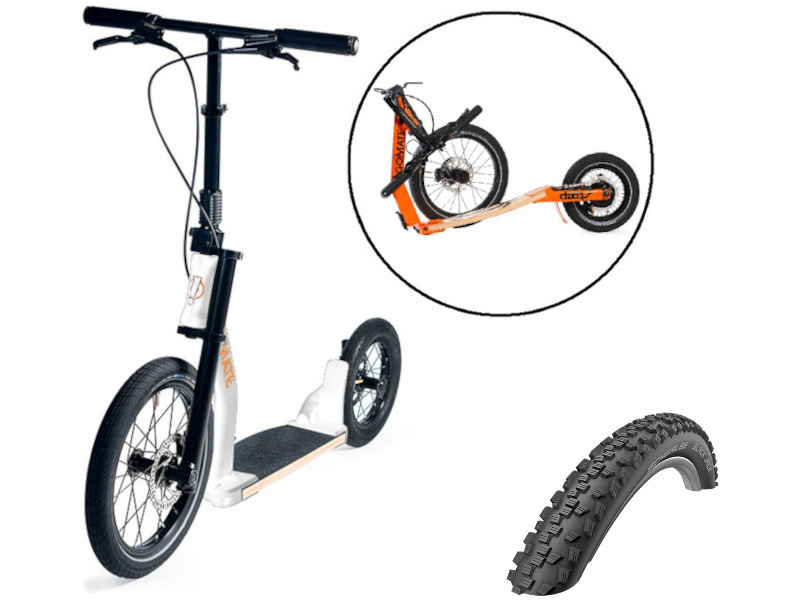 Přední 16" a zadní 12" kola zajišťují bezpečnou a pohodlnou jízdu. Díky terénním pneumatikám Schwalbe s vysokým lemem je jízda nejen pohodlná, ale můžete se vydat i na projížďky do terénu, ve kterém pneumatika poskytne potřebnou trakci. Použití 16" předního kola umožňuje bezproblémové překonání nerovností v městském prostředí či v přírodě.