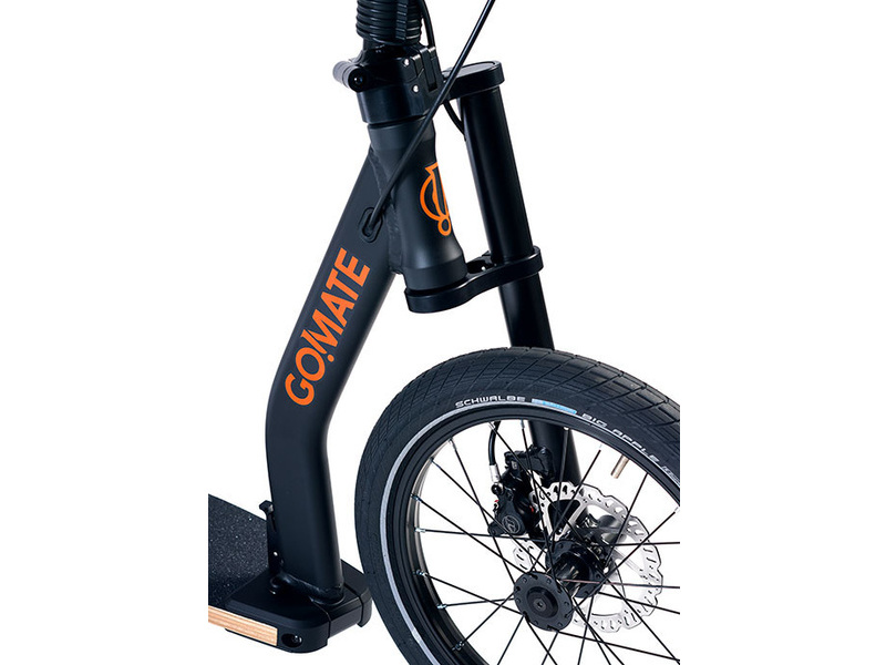 Nášlapná deska z vrstveného dřeva je plně integrovaná do rámu a slouží jako důležitý konstrukční prvek. Právě pružnost této nášlapné desky zajišťuje vysoce komfortní jízdu koloběžky Go!Mate. Tento systém předčí v jízdní vlastnostech i koloběžky s odpruženou vidlicí (odpružená vidlice navíc přidává další váhu).