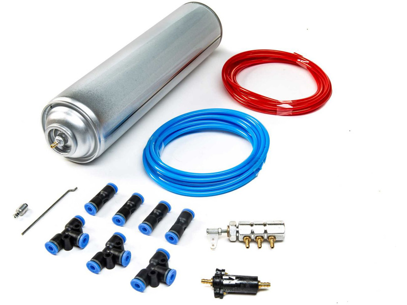 Náhradní díl pro RC model letadla Nakajima Ki-43 Oscar: Přislušenství pneumatického podvozku obsahuje tlakovou nádobu, hadičky, přepouštěcí ventil, rozbočovače a průchodky.