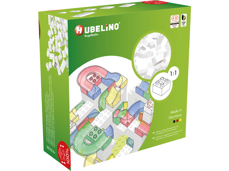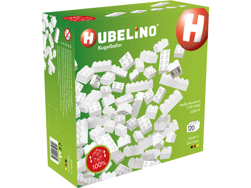 HUBELINO Kuličková dráha - bílé kostky 120 dílků. Skládejte kostky dle fantazie, přestavujte kuličkovou dráhu a rozšiřte ji s těmi kostkami. Vhodné pro děti od 4 let.