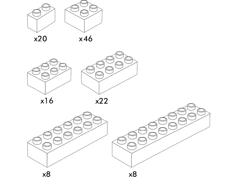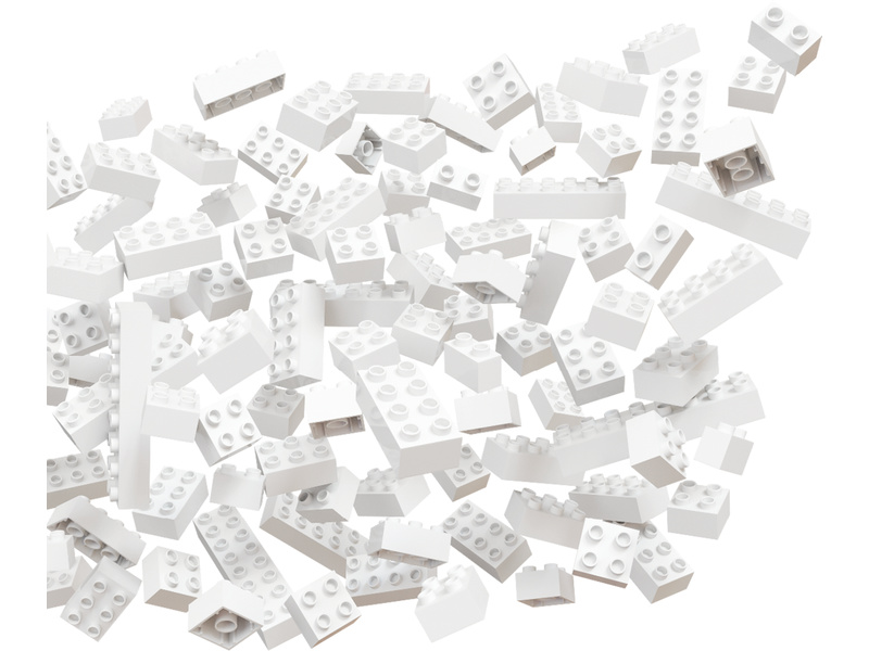 Balení obsahuje 120 bílých kostek (20 ks - 1x2, 46 ks - 2x2, 16 ks - 2x3, 22 ks - 2x4, 8 ks - 2x6, 8 ks - 2x8).