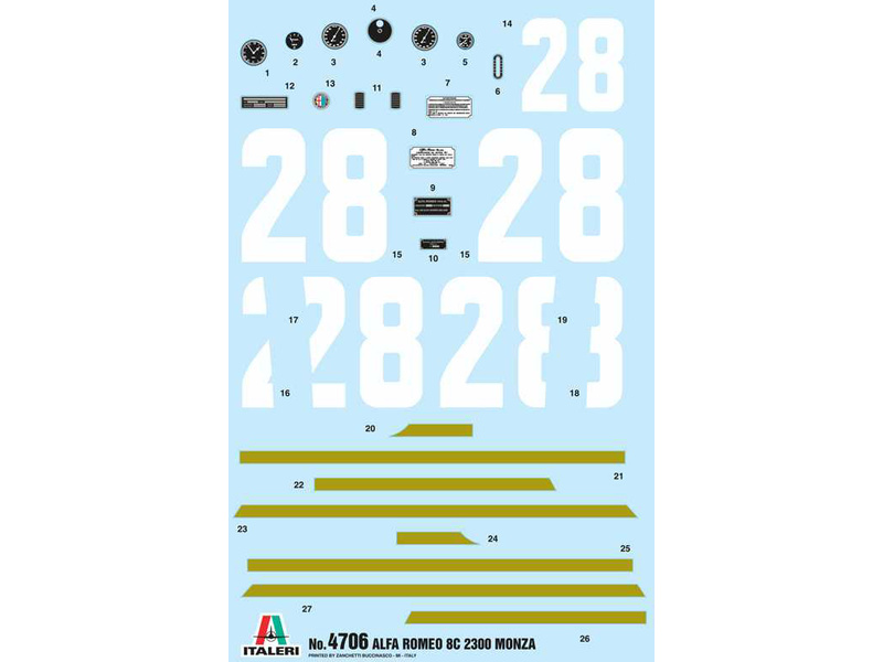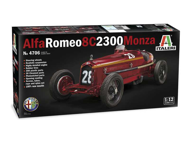 Plastikový model Italeri 4706 - auto Alfa Romeo 8C 2300 Monza v měřítku 1:12 ke slepení. Délka modelu 320 mm, obtížnost 5. Balení obsahuje SUPER OBTISKY.