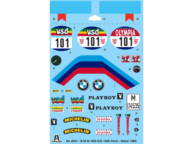 Plastikový model Italeri 4641 - motorka BMW 1000 Dakar 1985 v měřítku 1:9 ke slepení. Délka modelu 258 mm, obtížnost 5. Balení obsahuje SUPER OBTISKY.