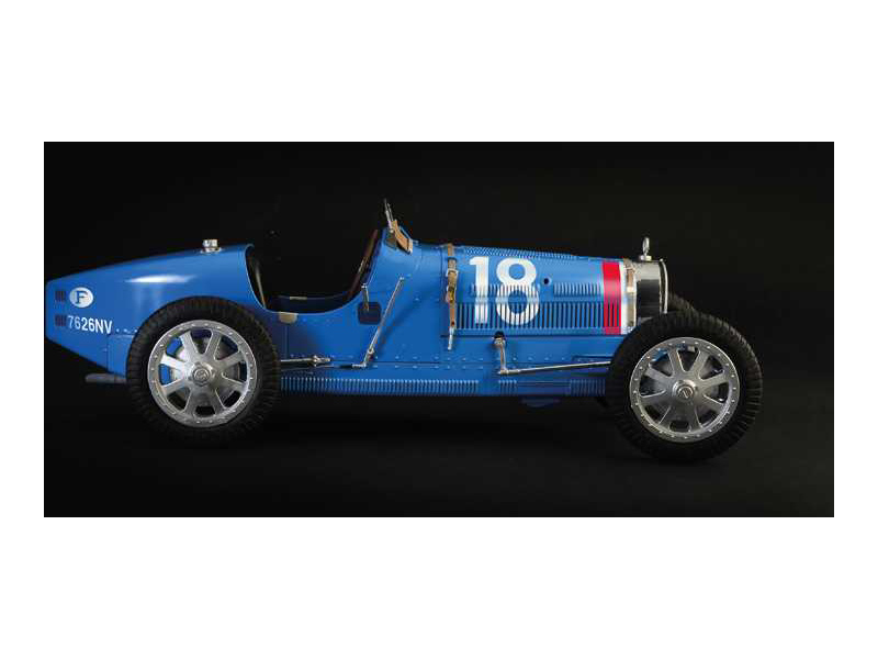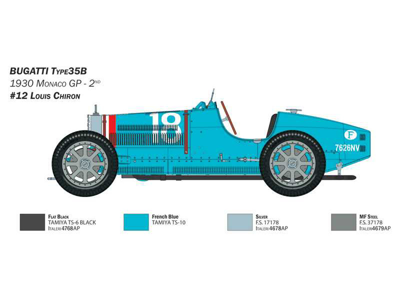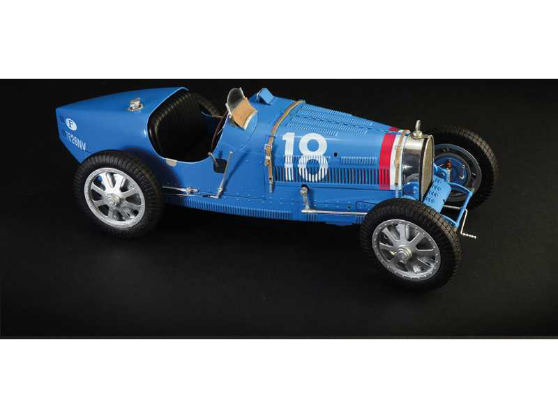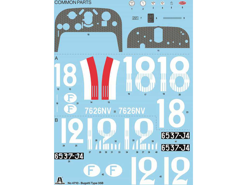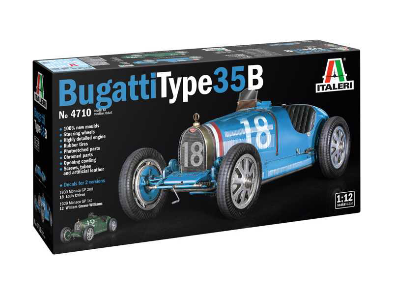 Plastikový model Italeri 4710 - auto Bugatti Type 35B v měřítku 1:12 ke slepení. Délka modelu 306 mm, obtížnost 5. Model je v detailním povedení a otevírací kapotou.