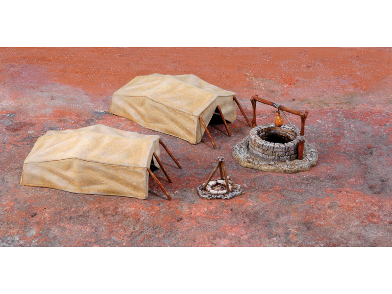Sada doplňující plastikové modely Italeri 6148 - diorama Desert Well and Tents v měřítku 1:72. Obtížnost 1. Balení obsahuje stany, ohniště a studnu.
