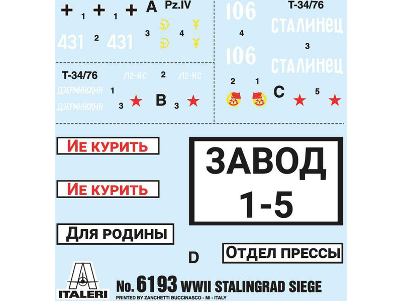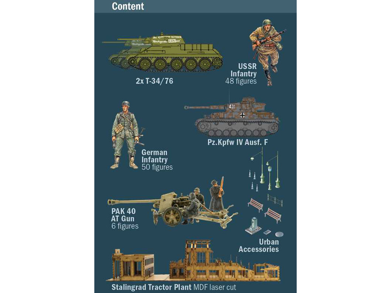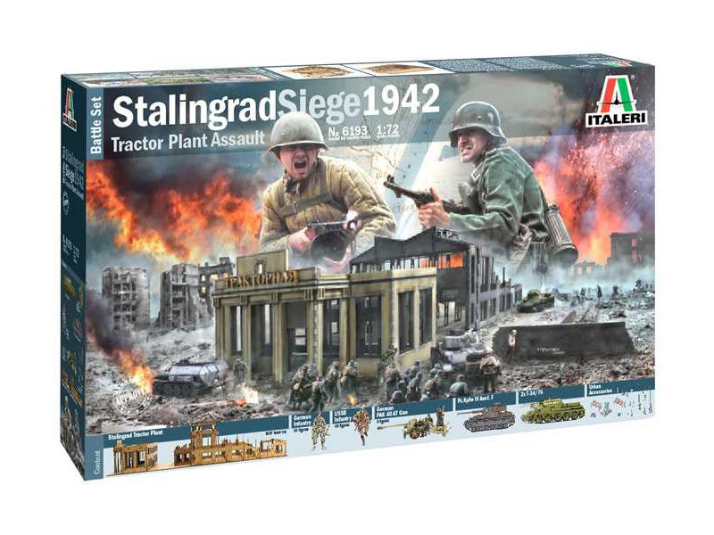 Plastikový model Italeri 6193 - diorama obležení Stalingradu 1942 v měřítku 1:72 ke slepení. Obtížnost 2. Balení obsahuje tanky, vojáky a budovy.
