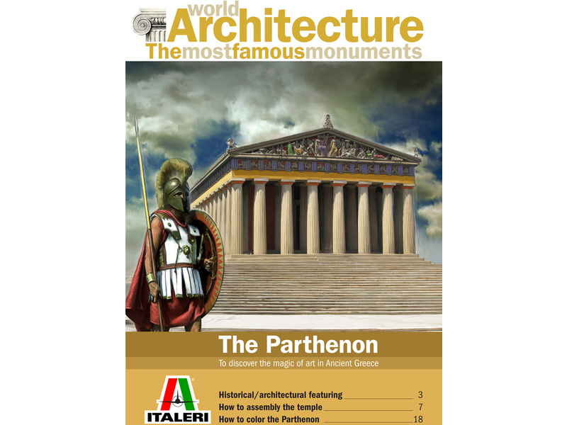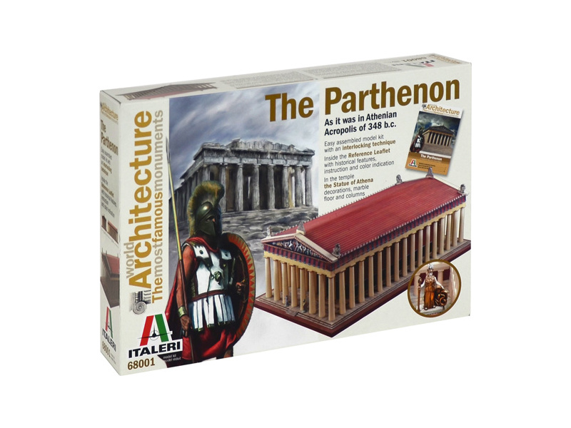 Plastikový model Italeri 68001 - diorama Parthenón. Velikost modelu 150 x 290 mm, obtížnost 1. Balení obsahuje všechny komponenty pro vytvoření chrámu.