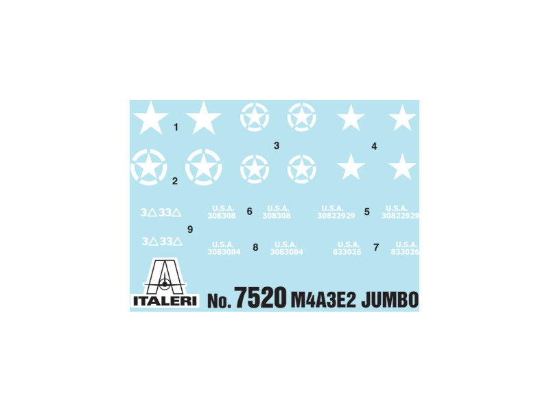 Plastikový model Italeri 7520 - Easy Kit tank M4A3E2 "JUMBO" v měřítku 1:72. Délka modelu 83 mm, obtížnost 1. Balení obsahuje DVA RYCHLE SESTAVITELNÉ MODELY a POTISKY PRO 1 VERZI.