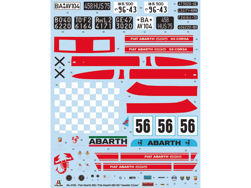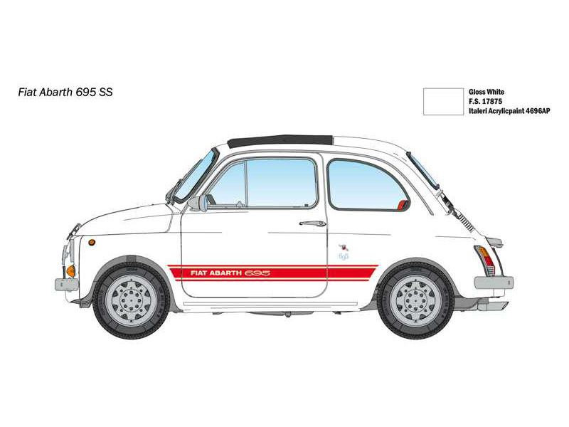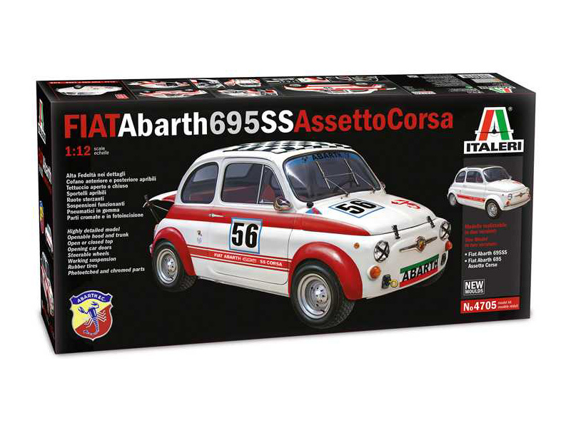 Plastikový model Italeri 4705 – auto Fiat Abarth 695SS/Assetto Corsav měřítku 1:12 ke slepení. Délka modelu 250 mm, obtížnost 5. Balení obsahuje SUPER OBTISKY.