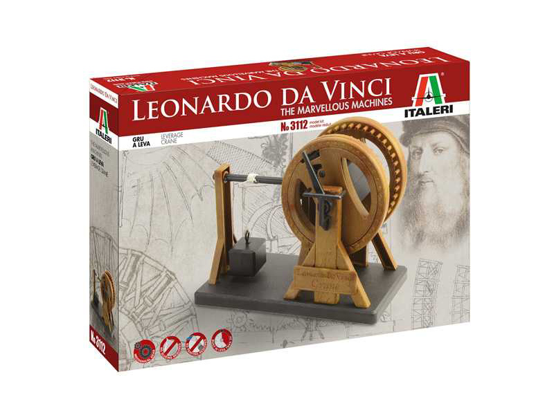 Plastikový model Italeri 3112 – Leonardo Da Vinci pákový jeřáb ke slepení. Obtížnost 1, délka modelu přibližně 160 mm.
