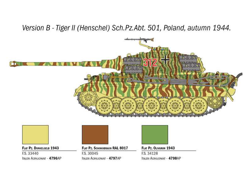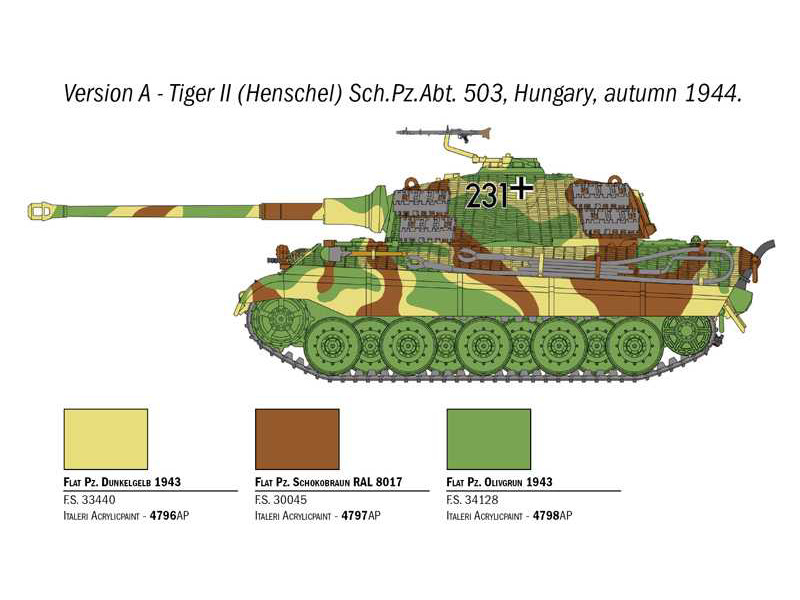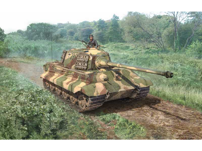 Těžký tank Sd.Kfz 182 Panzer VI Ausf. B "King Tiger" vstoupil do služby u německé armády v polovině roku 1944. Oproti svému předchůdci, modelu Tiger I, se v několika věcech lišil a dostal určitá vylepšení: zcela nový podvozek, zkosenou přední část korby a silnější pancíř (kvůli kterému narostla jeho celková hmotnost na téměř 70 tun) a jako hlavní výzbroj smrtící 8,8 cm dělo KwK 43 L/71. Motor Mayback V-12 dokázal rozpohybovat i tak obrovskou masu, jakou Königstiger byl, na maximální rychlost 42 km/h. V masové výrobě se osazoval dvěma různými verzemi věží: Porsche, která se používala hlavně na začátku, a Henschel, kterou nakonec dostala většina strojů. Do obou z nich se vešlo 80 nábojnic pro hlavní kanón. Vůbec první, kdo Tiger II použil v ostrém boji, byl 503. těžký obrněný prapor, který ho nasadil v bitvě o Normandii v červenci 1944.